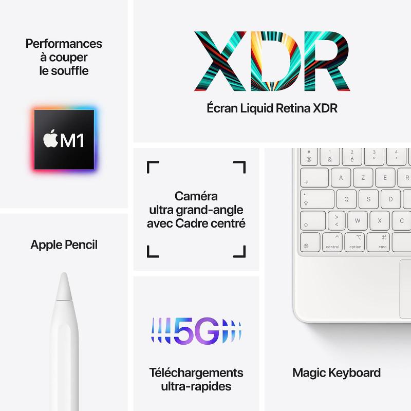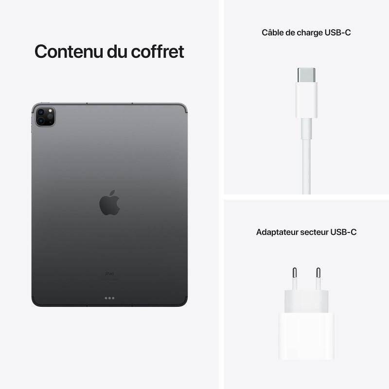 Appareil Photo Arrière: 12 MP, Appareil Photo avant: 12 MP, avec Wi‑Fi + Cellular, 5G, Bluetooth 5.0 - Batterie: Lithium polymère - Capacité batterie: 40,88 Wh - Autonomie de batterie: 9 heures - Capteur: Face ID - Dimensions: 215 x 281 x 6 mm